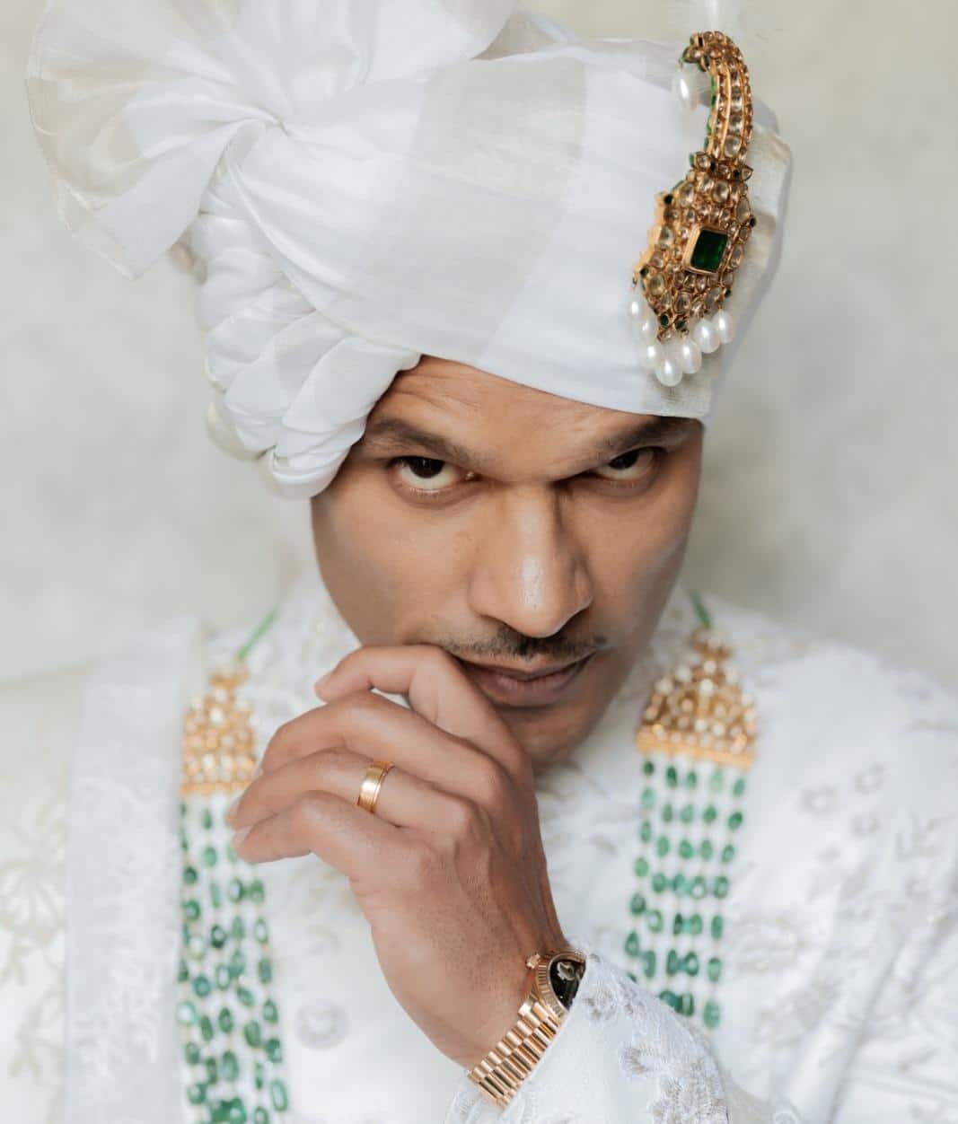 रॉयल पोर्ट्रेट्स: गैलरी में दूल्हे शिखर धवन की सफेद पर सफेद कढ़ाई वाली शेरवानी और पगड़ी पर मोती और पन्ना सरपेच में एक आकर्षक तस्वीर है। सोफी शाइन एक नाटकीय एकल चित्र में भी दिखाई दे रही है, जिसमें 3डी पुष्प कढ़ाई और मोती से लिपटी चोली के साथ उसके शैंपेन-आइवरी लहंगे का पूरा विवरण दिखाया गया है।